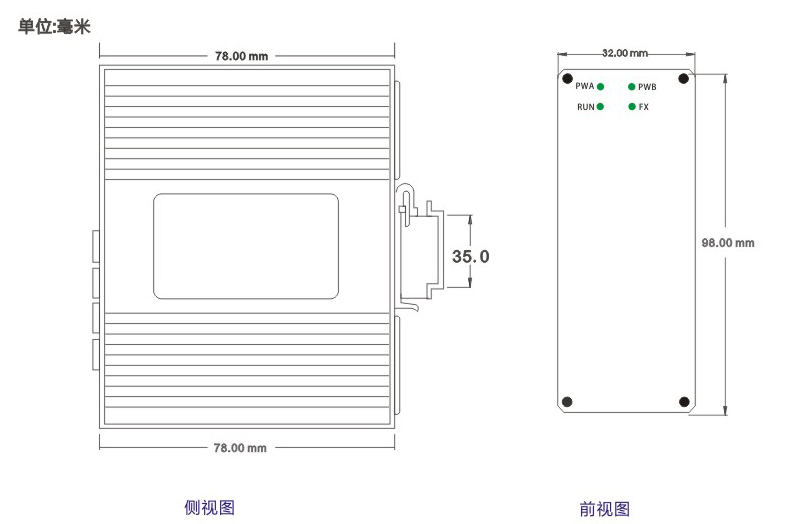 外壳:铝制机箱散热表面设计无风扇,IP30 防护等级 尺寸:98*72*32 mm 重量:370g 安装方式:导轨安装/壁挂式安装 |