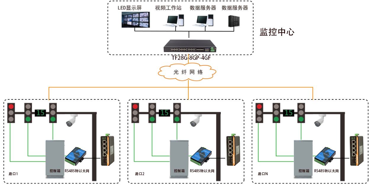 闯红灯违章行为是在城市交通的众多违章行为并造成城市交通秩序混乱、交通堵塞及引发交通事故的重要原因之一。城市交通诱导系统能够提升城市道路交通效率的重要手段,有效地引导车辆运行,减少车辆的旅行时间,并最终实现交通量在整个路网中均衡分配的技术手段。本方案层次结构分明,将路口的控制箱作为网络接入层,在此采用1光4电的工业以太网交换机负责接入路口高清摄像机和信号机的数据,控制箱内部的交换机通过单模光纤上行至监控中心,该方案不仅仅有效的解决了网络拥堵,保障整个网络高效、高速运行,视频更加流畅,采集信号无延时,所有的工业以太网交换机都通过EMC四级测试,有效避免了由于电磁干扰对整个系统造成的影响,真正做到稳定有效。